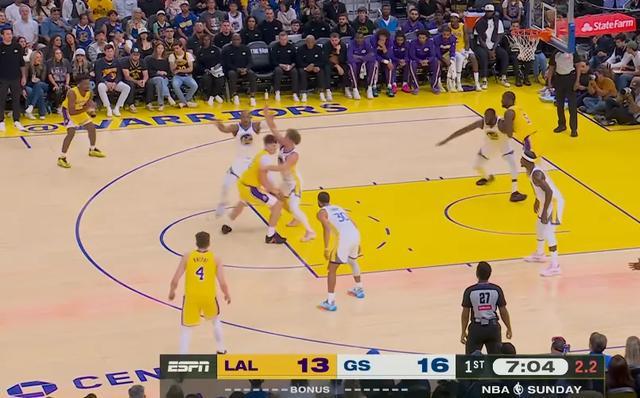 第二次包夾,在邊線瞅準(zhǔn)時(shí)間果斷包夾布朗尼,導(dǎo)致后者丟球,霍福德數(shù)據(jù)表上記上一次搶斷?;舾5碌谝淮蔚菆?chǎng)五分多鐘,勇士這段時(shí)間贏了14分,霍福德雖然一分不得,但在場(chǎng)上做對(duì)了所有事情。