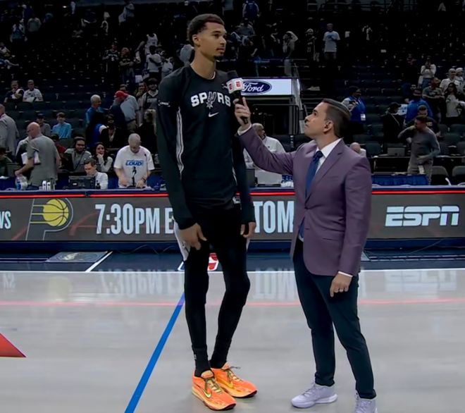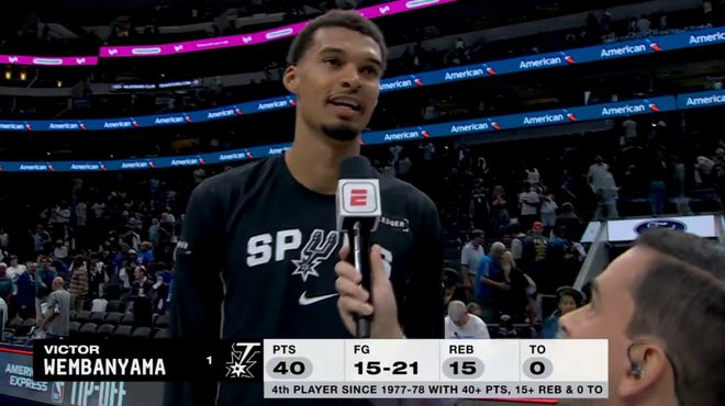 獨(dú)行俠坐擁萊弗利、濃眉哥、弗拉格的內(nèi)線(xiàn)三塔,但他們加起來(lái)一共也只拿到了36分,而文班29分鐘狂轟40+15,得分比他上場(chǎng)時(shí)間高多了,更嚇人的是命中率21投15中,罰球11中9,順便還有3個(gè)蓋帽攻防一體!