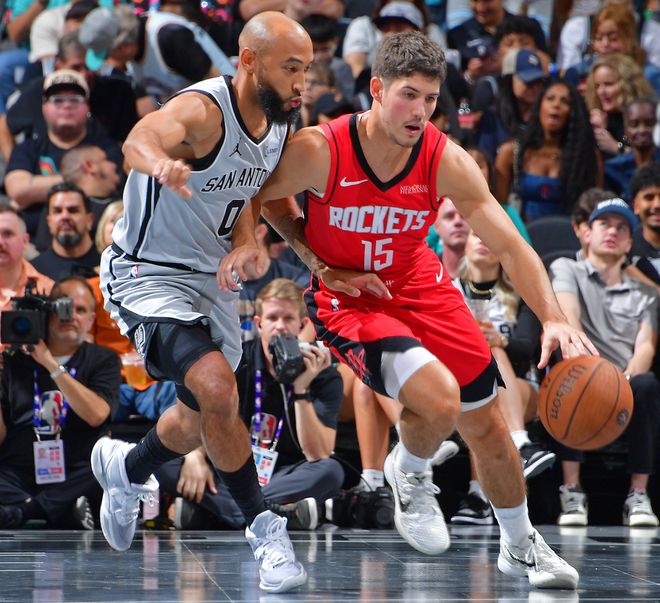 第二節(jié)火箭隊一度領先馬刺達到11分,沒想到在第二節(jié)結束前的2分鐘火箭直接崩盤了,馬刺在卡斯爾的帶領下打出一波12-0的攻勢完成反超,馬刺主場的球迷們已經(jīng)開始沸騰了,卡斯爾連拿7分2助攻2搶斷1蓋帽成為圣城英雄。