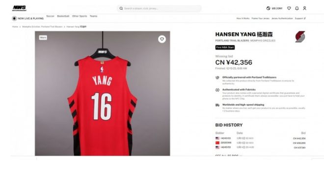 在12月8日開拓者客場(chǎng)96-119輸給灰熊的比賽,楊瀚森迎來NBA生涯首次首發(fā)比賽,該場(chǎng)比賽他貢獻(xiàn)4分5籃板2助攻。如今楊瀚森該場(chǎng)比賽首發(fā)穿的球衣,已經(jīng)被拍賣最終成交價(jià)是42356元,展現(xiàn)出不俗的商業(yè)價(jià)值。
